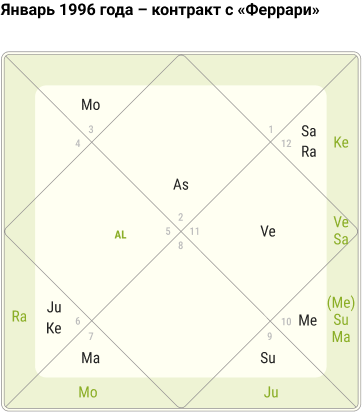 В то время был полувозврат лунных узлов (5-й и 11-й дома), Юпитер шел по 8-му дому (АВ-4) в Стрельце (благоприятно). Сатурн по 10-му дому (АВ-3) в своем знаке Водолей (благоприятно). Период Сатурн/Венера (2/12, Лагнеш и йога-карака – благоприятно – оставление одной команды (12), ради другой, материальная выгода (2) – эти комбинации помогают Михаэлю и его новой команде стремительно развиваться, и в скором времени они завоевывают кубок конструкторов.