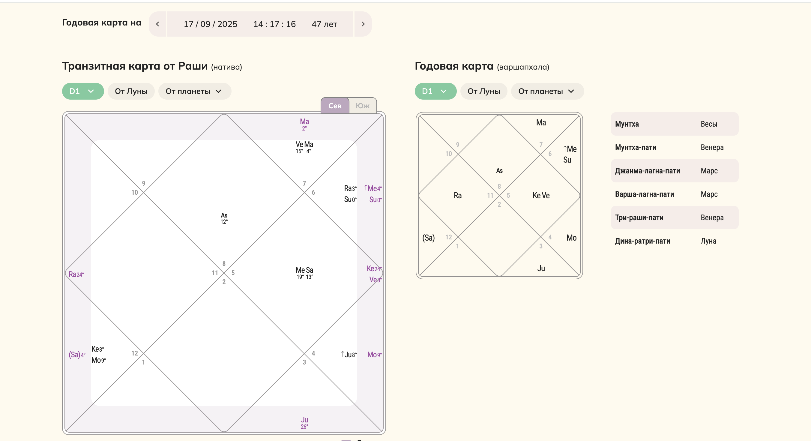 На сайте jyotiapp.ru представлена большая транзитная карта (от карты натива) на момент возврата Солнца в день рождения, а также маленькая карта - Варшапхала. Рядом расположена таблица с Мунтхой и другими показателями.