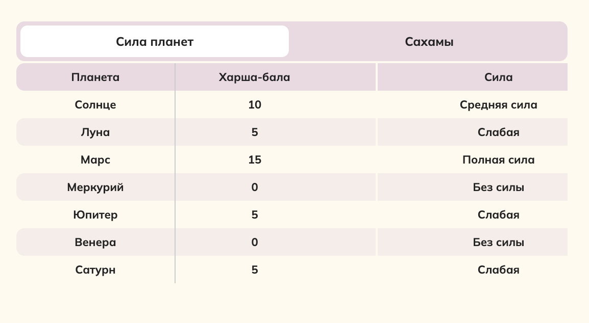 Рядом с Сахамами, во вкладке Сила планет, находится расчет Харша-бала.