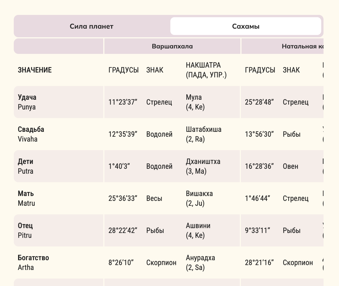 Сахамы – математические точки событийности в Варшапхале. Они рассчитываются по формулам разности долгот планет и Лагны.